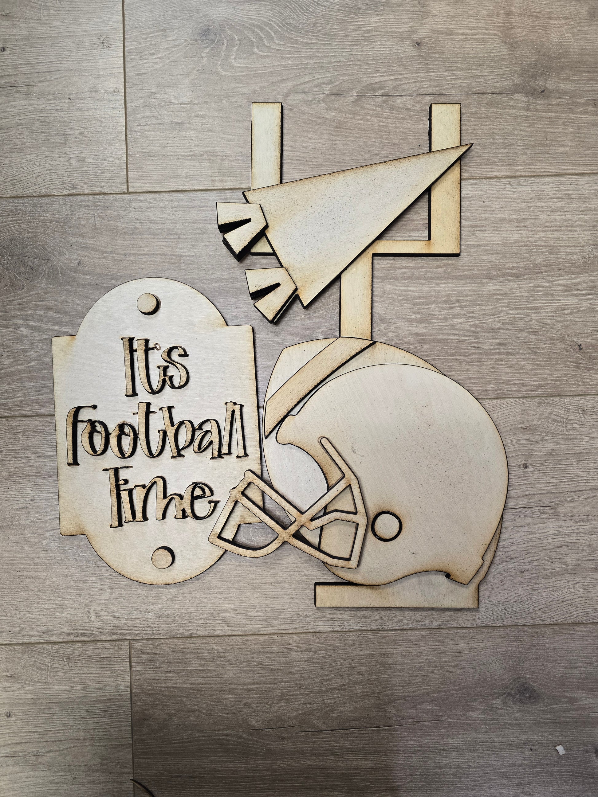 Show your team spirit with this football-themed DIY kit! Includes a helmet, goal post, pennant, and “It’s Football Time” sign — ready to paint in your favorite team colors. Crafted from birch plywood. This is apart of the 4 FT Porch Leaner set.
