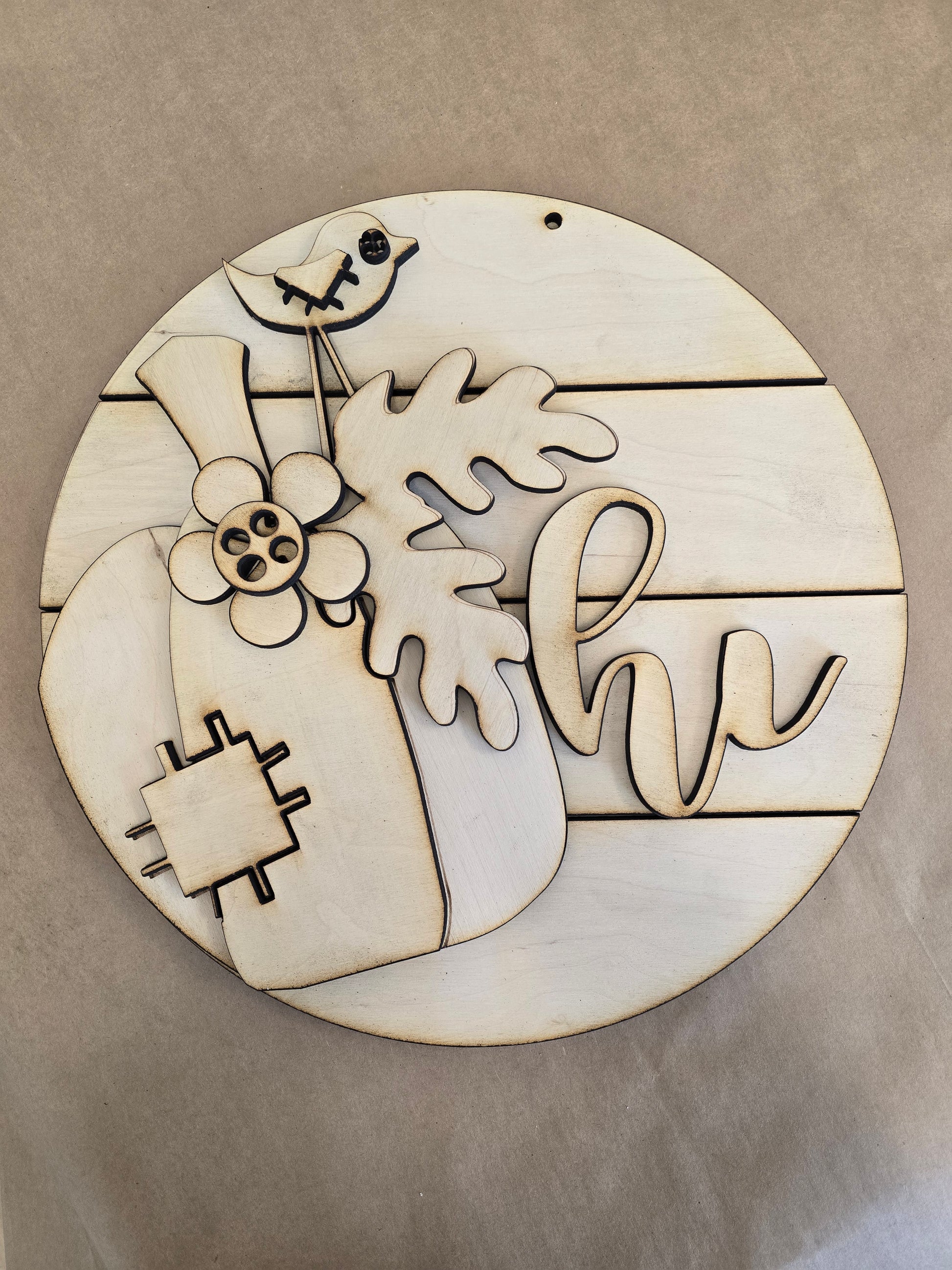 Add a homespun touch to your fall décor with this round sign featuring a patchwork-accented pumpkin, leaves, and a sweet “hi” greeting. Made from birch plywood, it’s ready to be customized with your favorite autumn colors.